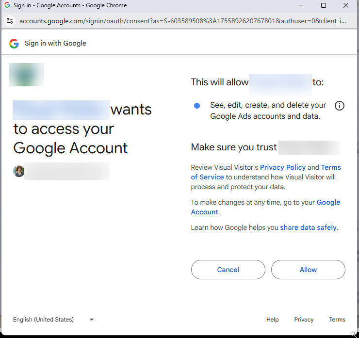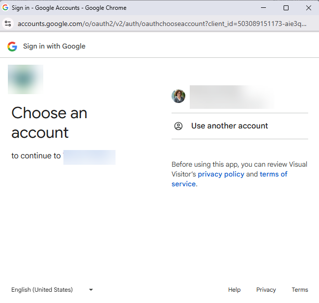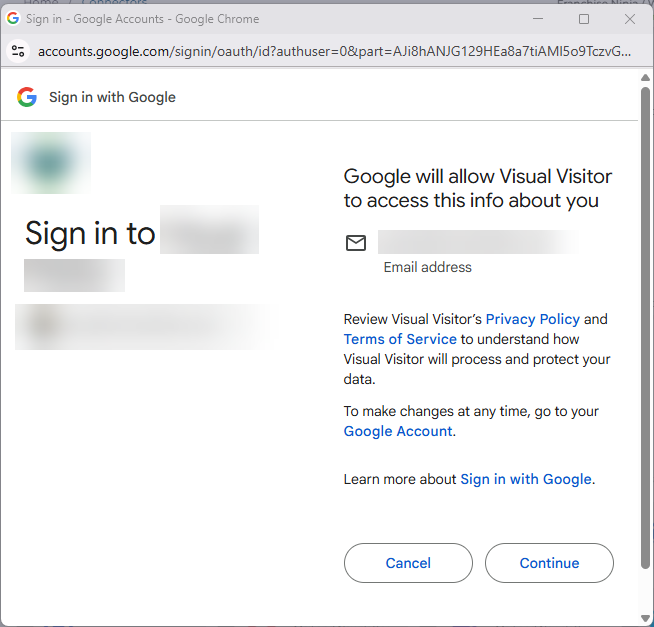 After you've selected 'Connect', Google will pop up a new window asking if you'd like to continue with your profile. Select the Google Account you'll be connecting with.