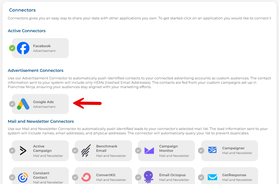 Franchise Ninja offers a great feature called Connectors. Advertisement Connectors automatically push identified contacts to your connected advertising accounts as custom audiences. The contact information sent to your system will include only HEMs (Hashed Email Addresses). The contacts are fed from your custom campaigns set up in Franchise Ninja, ensuring your audiences stay aligned with your marketing efforts.