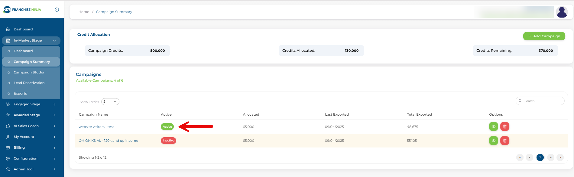 Step 2: View your list of campaigns. Active campaigns will be shown in green. Inactive campaigns will be shown in red.
