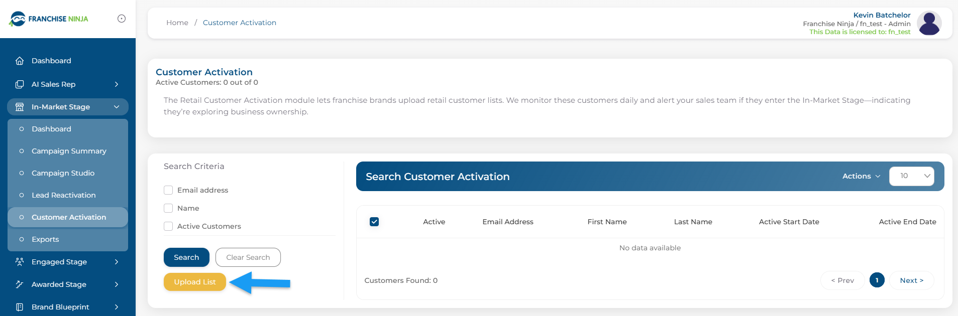 Customer Activation can be found in the In-Market Stage in the Franchise Ninja platform. This module's full name is Retail Customer Activation. This module lets franchise brands upload retail customer lists to the platform. We will then monitor these ...
