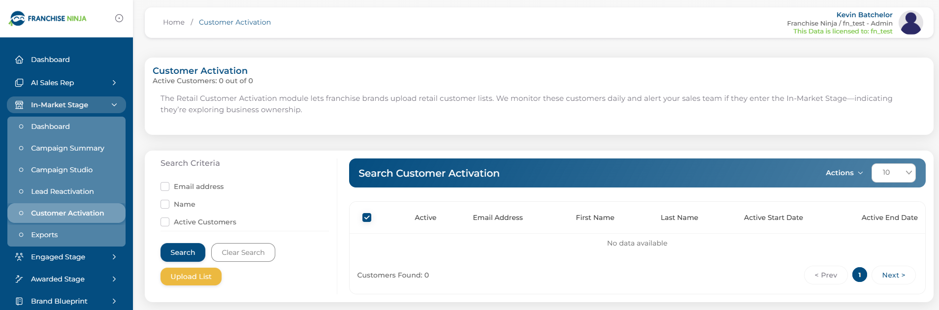 Customer Activation can be found in the In-Market Stage in the Franchise Ninja platform. This module's full name is Retail Customer Activation.
